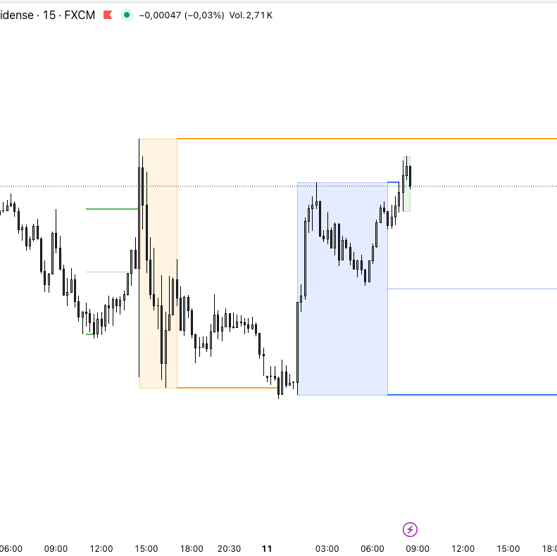 Indicator that plots session levels (High, Low, 50%) and range boxes, extending levels until the price touches them.