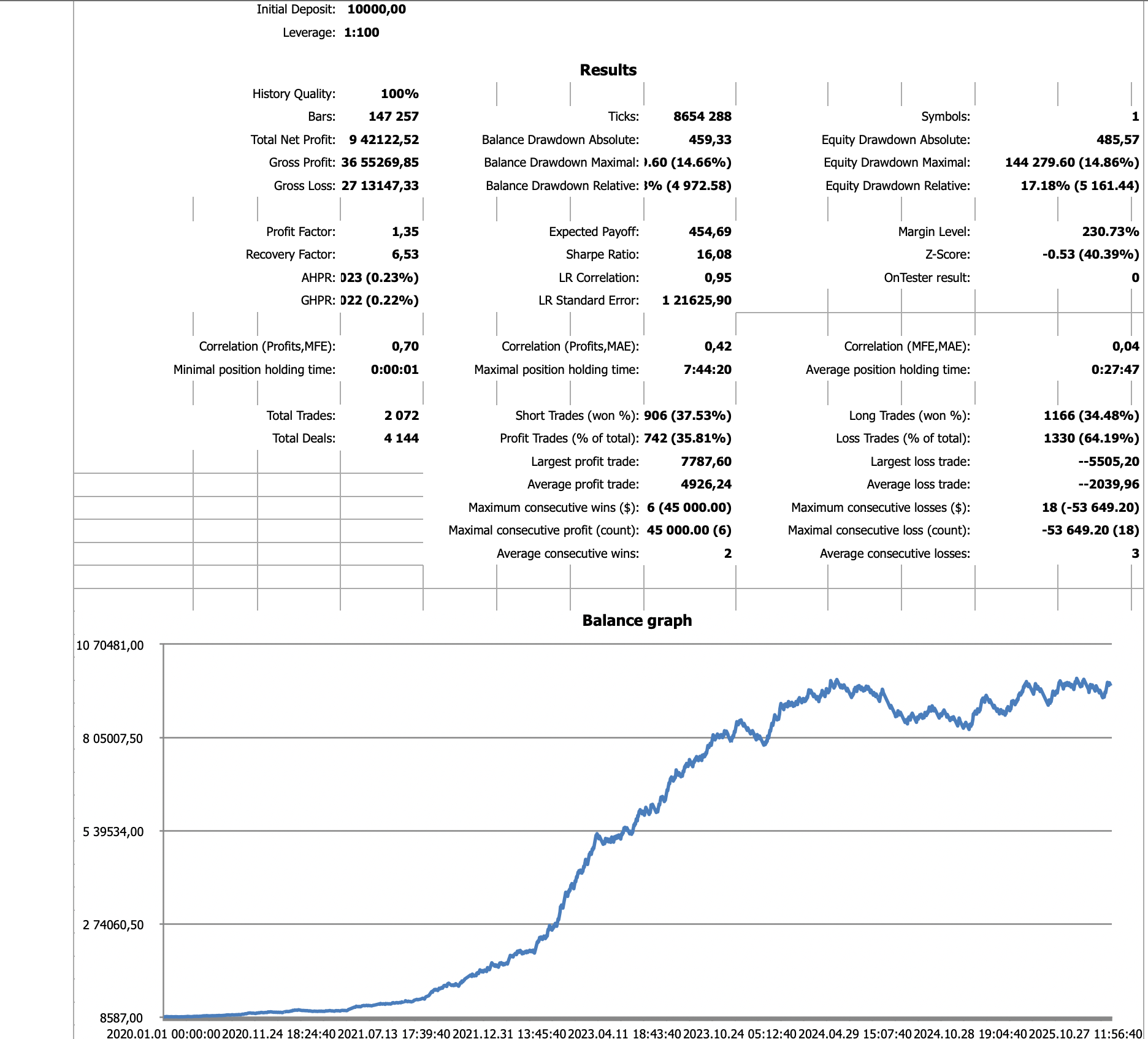 Risk management is fully integrated. Position size can be calculated as a percentage of equity or as a fixed lot size. Spread filters prevent entry into poor market conditions. Session filters allow trading only during London, New York, or both. Furthermore, daily drawdown limits can be defined as a percentage to halt trading when the limit is reached and, optionally, close all open positions upon reaching that limit. All of this helps maintain disciplined trading across diverse market environments.